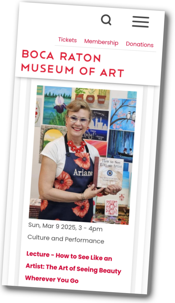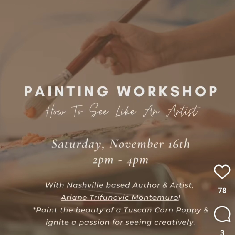 Learning to see beauty will inspire your own unique way of seeing the world. Begin your journey with the help of my little book and then a workshop based on the principles of How to See Like an Artist. Since beauty is everywhere, a workshop may take place indoors or perhaps it could take the form of a city tour or a walk on the beach!